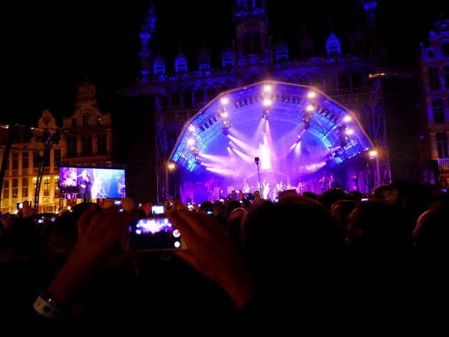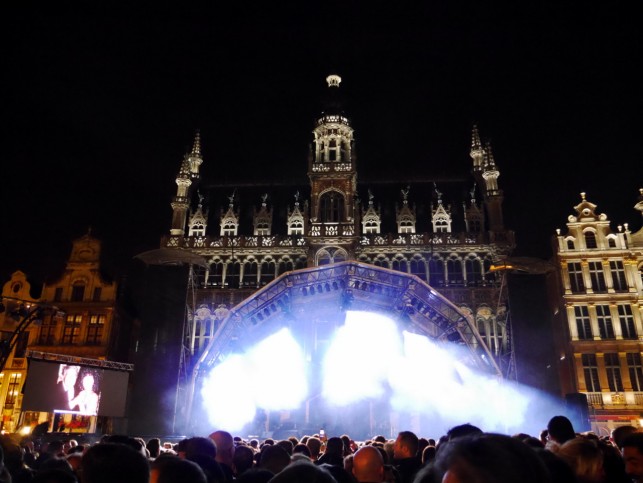 À 21h45, la décision est prise de quitter l’appartement pour se rendre sur la Grand-Place. Se dire qu’une bonne demi-heure d’attente serait amplement suffisante. La Bourse a été transformée en centre de tri, invitation en main, en cinq minutes deux bracelets sont obtenus : un pour l’entrée, et un autre aux couleurs fluo du sponsor de la soirée. À l’arrivée sur la Grand-Place, l’espace n’est pas encore saturé. Certes, la foule est présente, mais c’est encore supportable.