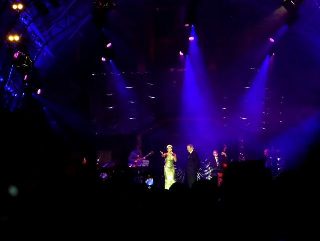 Et le concert commence avec Cheek to Cheek, They All Laughed, Anything Goes (remarque d’une jeune fille devant : « Ce n’est pas une chanson dans Indiana Jones ? »). C’est agréable à écouter, et sur les écrans, on perçoit une réelle complicité entre un Tony Bennett élégant et une Lady Gaga habillée d’une robe en lamé doré. Au-delà de leurs origines italo-américaines et new-yorkaises, ils partagent aussi des études dans des écoles artistiques, ce qui leur fait déjà quelques points communs.